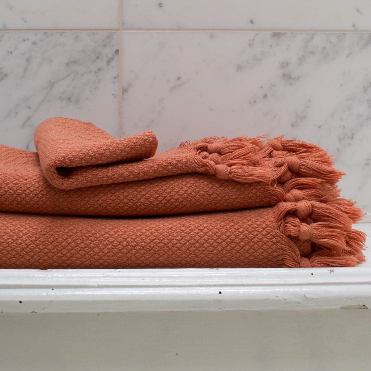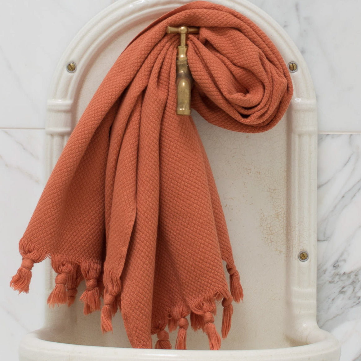 Dieses Pestemal wird in der Türkei in einer Dorfweberei im traditionellen Holzwebrahmen in Handarbeit gewebt, die Kettfäden werden ebenfalls per Hand verknotet. Das fein eingewebte Rautenmuster macht das reine Baumwolltuch schön griffig und saugfähig. Es fühlt sich seidig weich an und ist perfekt geeignet als: