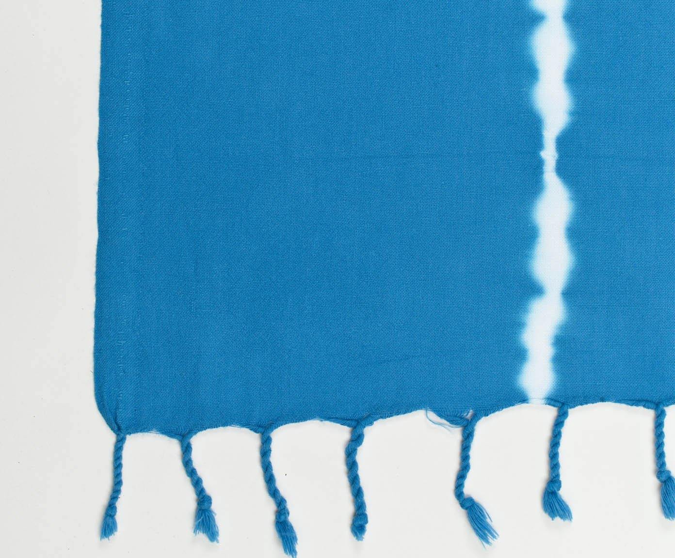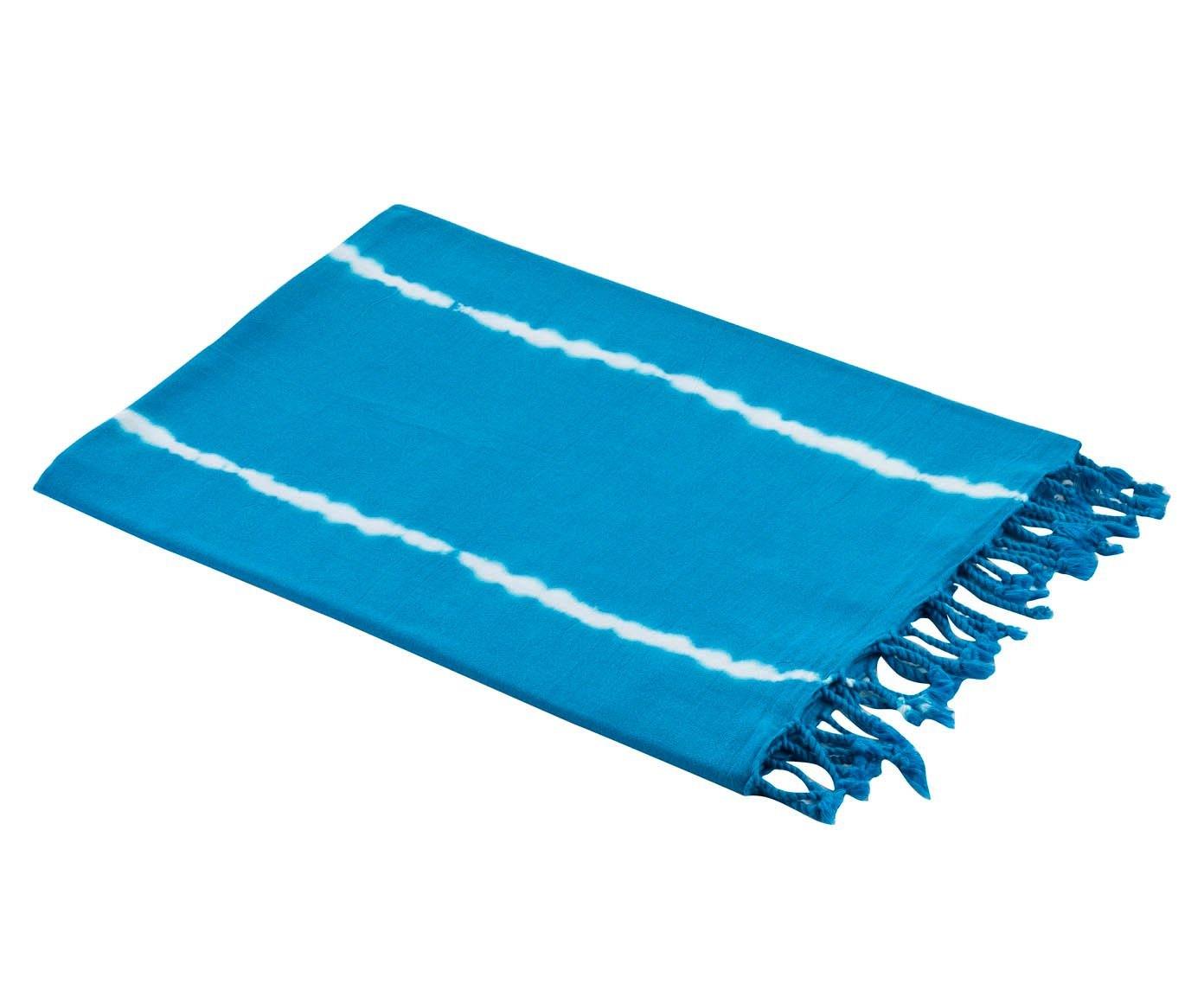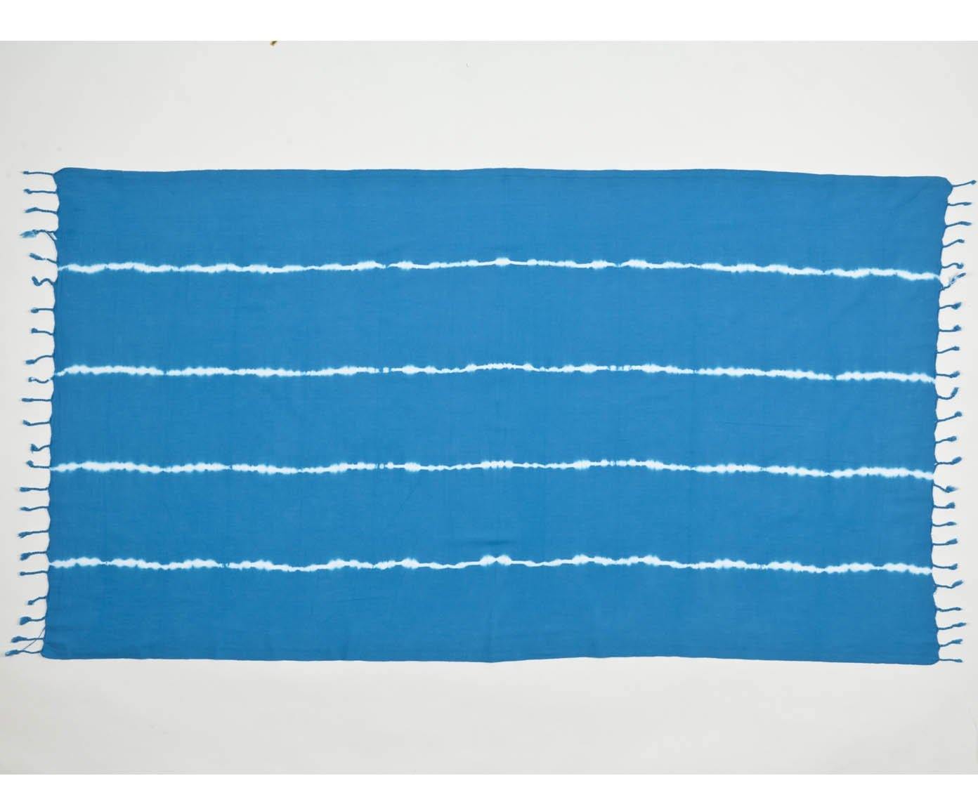 ca. 90 x 170 cm, 100% Baumwolle, blau mit gebatikten weißen Streifen, ca. 250 Gramm. Waschen bis zu 40 Grad, Wäschetrockner möglich, mäßig heiß bügeln.